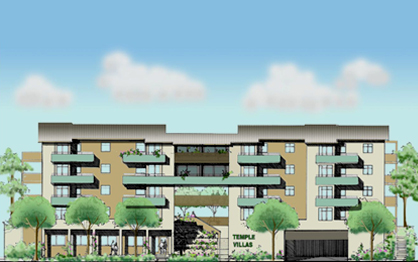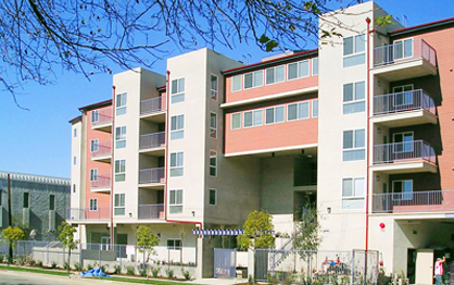 New construction of 52 affordable family units situated between an arterial street and the Hollywood Freeway. Within walking distance of downtown, the location is easily accessible by bus. The site slopes up from street edge to freeway. Parking is at street level, underneath the rising site. The entry lobby, social services offices, computer lab and a community room with an outdoor barbeque are also at street level.