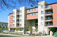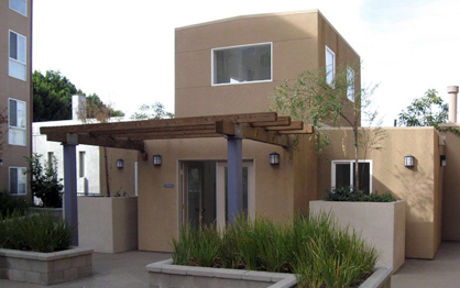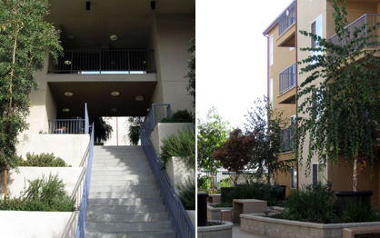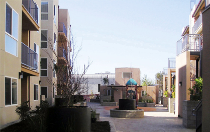 Other amenities include a laundry room and playground located in the raised courtyard. The street-edge building – with double-loaded flats – is relatively open with a two-story high entryway leading from street to courtyard (flanked by the accessible elevator entrance through the lobby). The freeway-edge building is a dense wall of stacked townhouse units set against the freeway berm and shields the courtyard from the noise of 101 South.