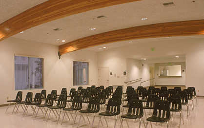 The multipurpose room seats 200 in stack chairs and opens up to the courtyard. The courtyard landscape was extensively re-worked. Abatement of hazardous materials during renovation, included removing asbestos-bearing stucco, roofing materials, floor tiles, spray-on or “popcorn” acoustic ceilings, light-fixture heat shields and drywall “mud”.
