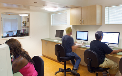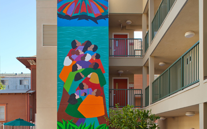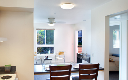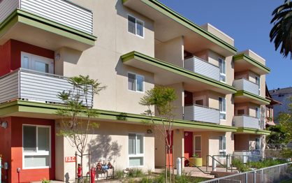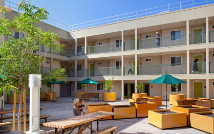 Among the common spaces provided are social services offices, a computer lab, shared lounges with kitchenette, and laundry facilities. Courtyard amenities include a barbeque/picnic area, fruit trees and raised beds for vegetable gardening. Certified as an LEED Gold Project.